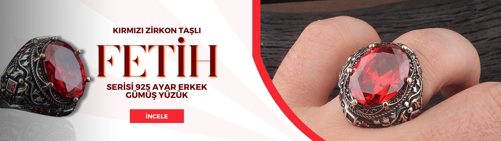 Fetih Serisi Kırmızı Zirkon Taşlı 925 Ayar Erkek Gümüş Yüzük
