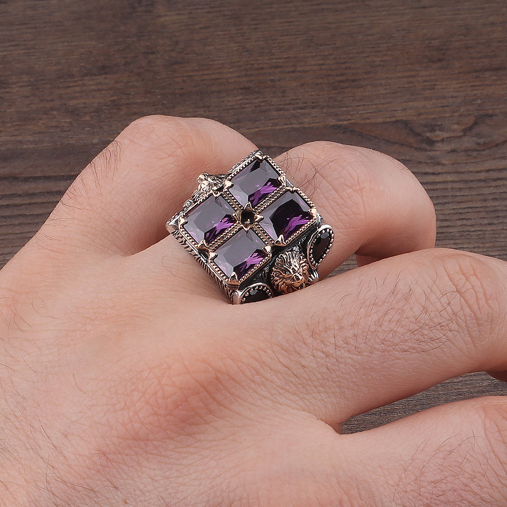 Aslan İşlemeli Ametist Taşlı 925 Ayar Erkek Gümüş Yüzük