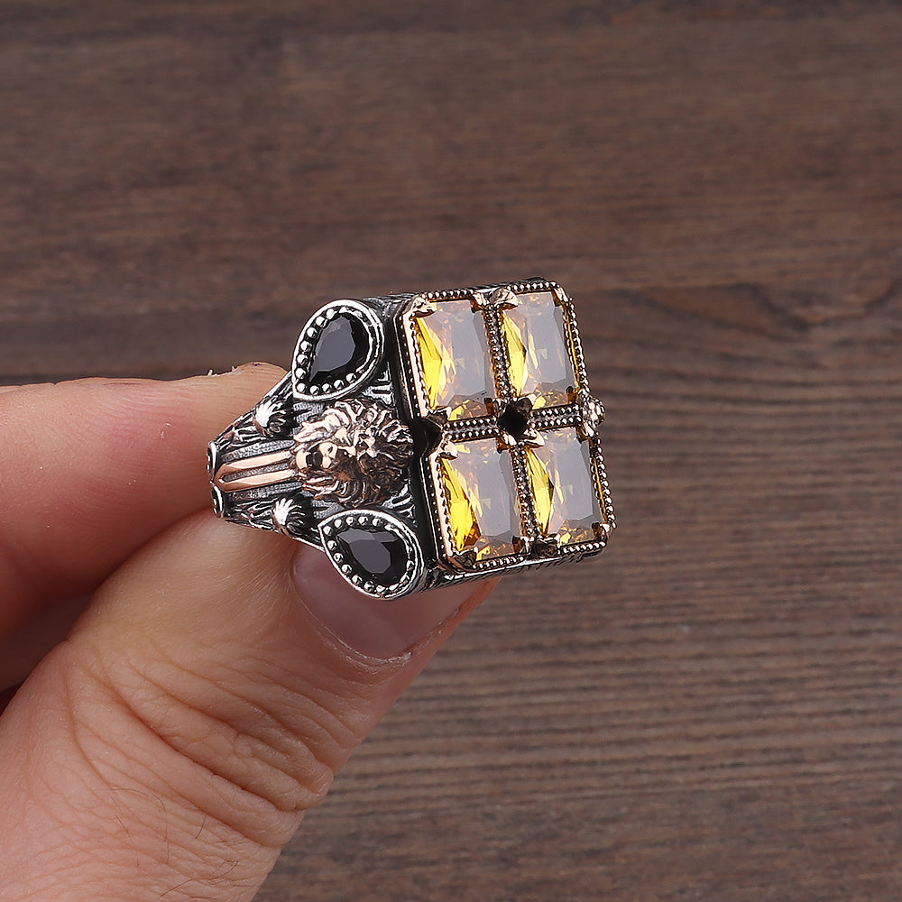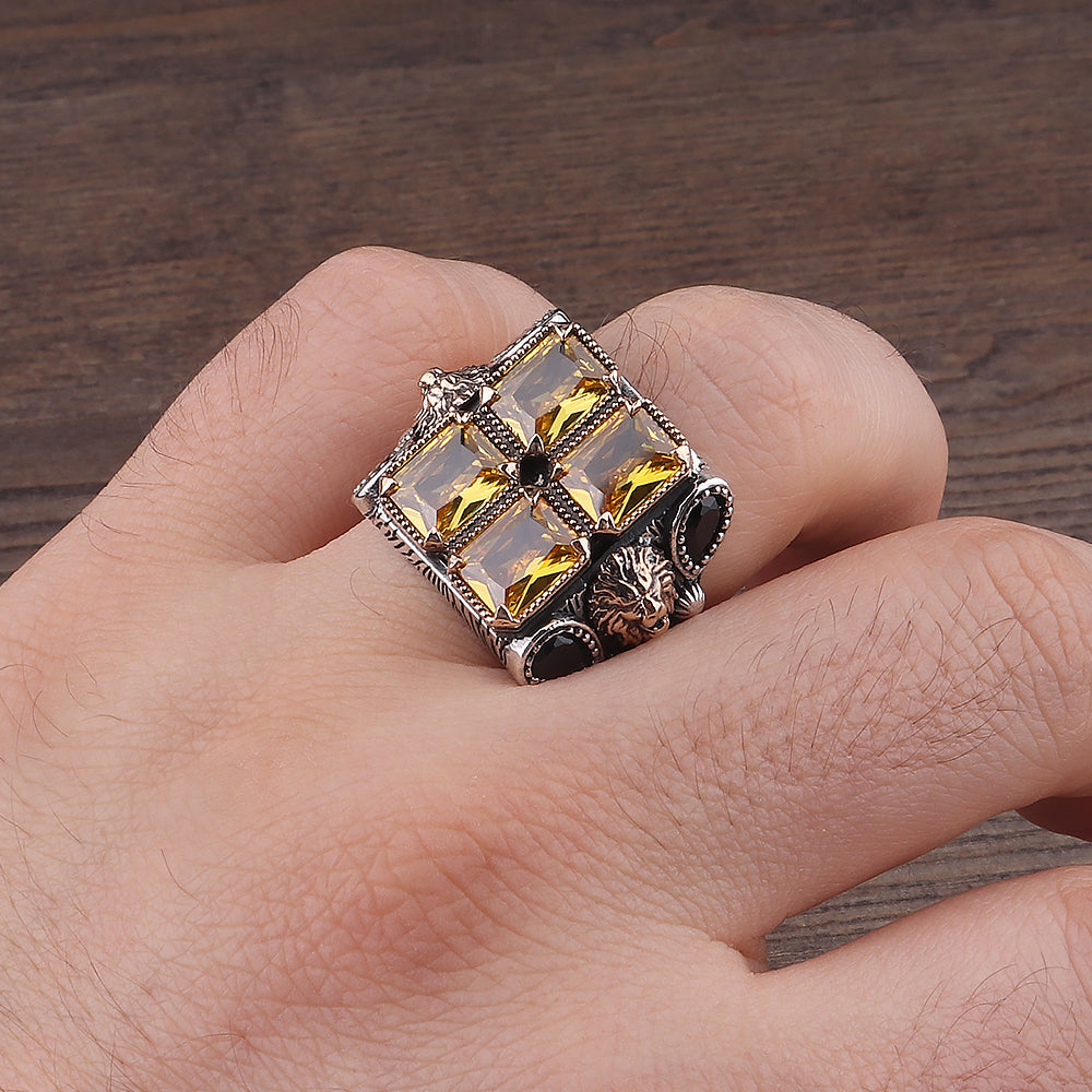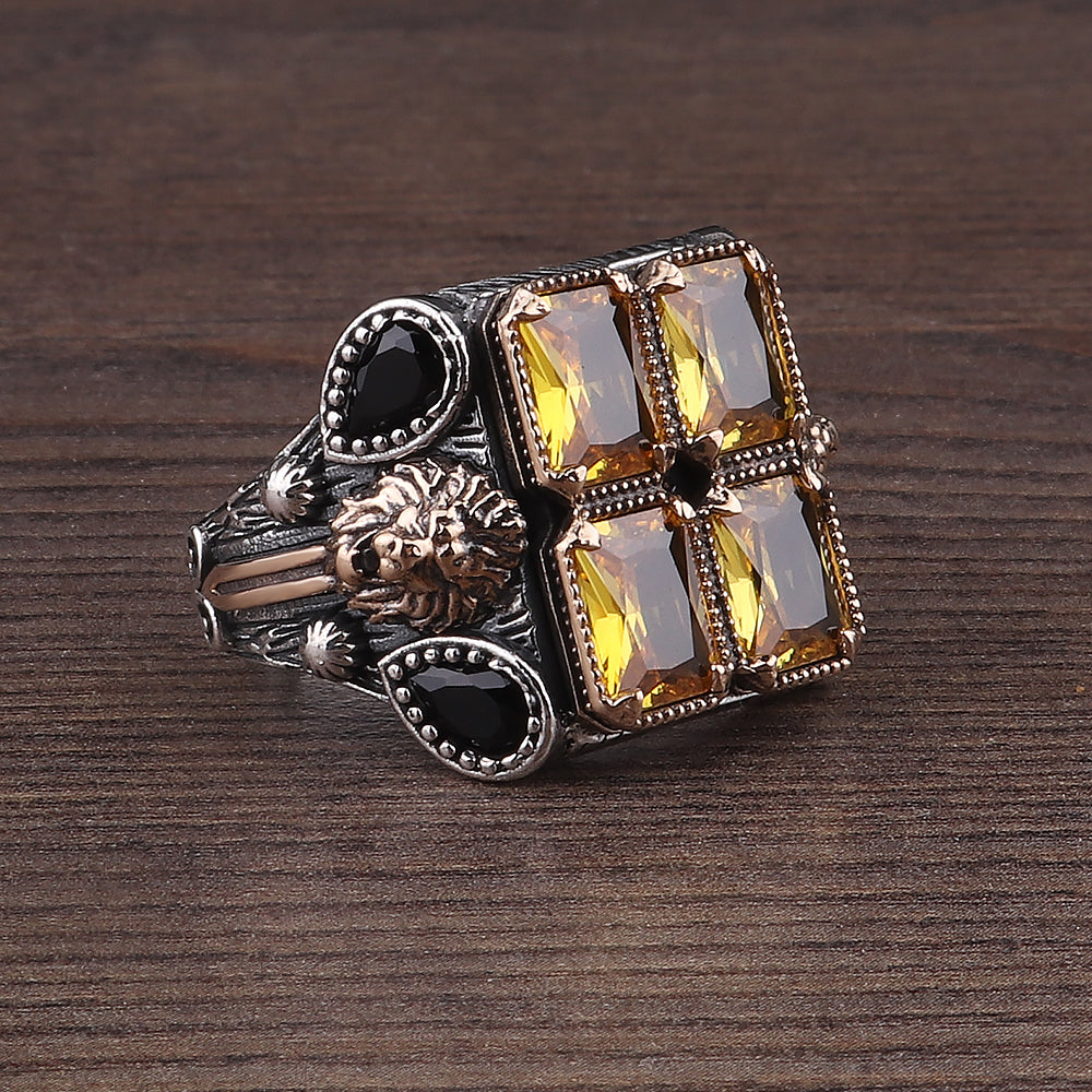 Aslan İşlemeli Sitrin Taşlı 925 Ayar Erkek Gümüş Yüzük