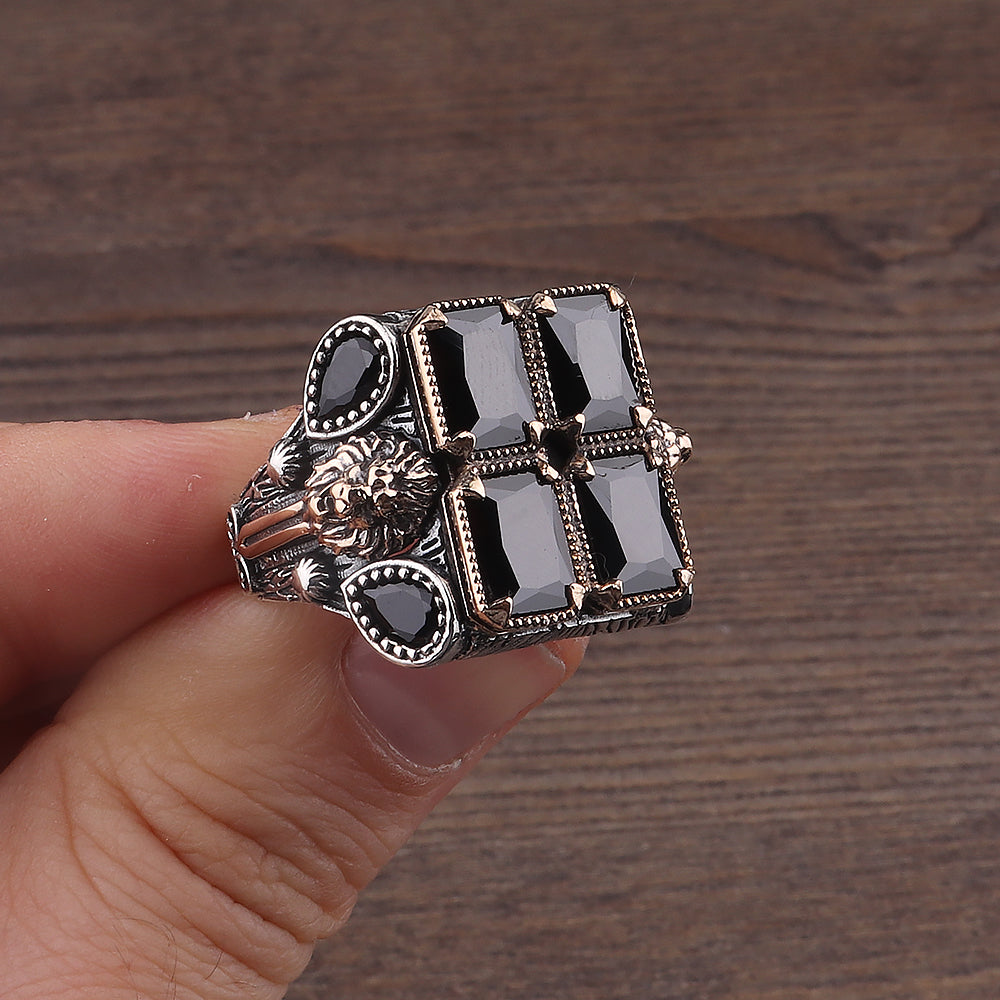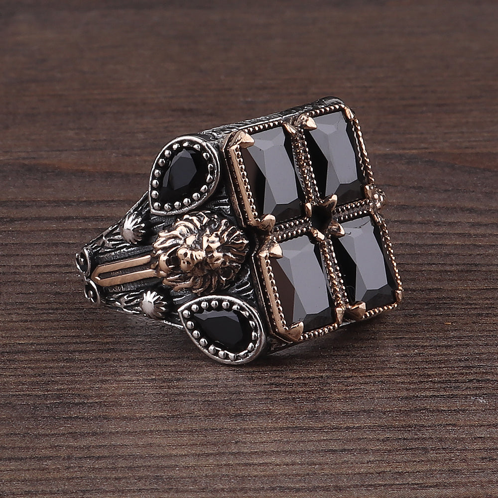 Aslan İşlemeli Zirkon Taşlı 925 Ayar Erkek Gümüş Yüzük