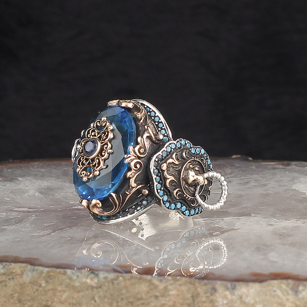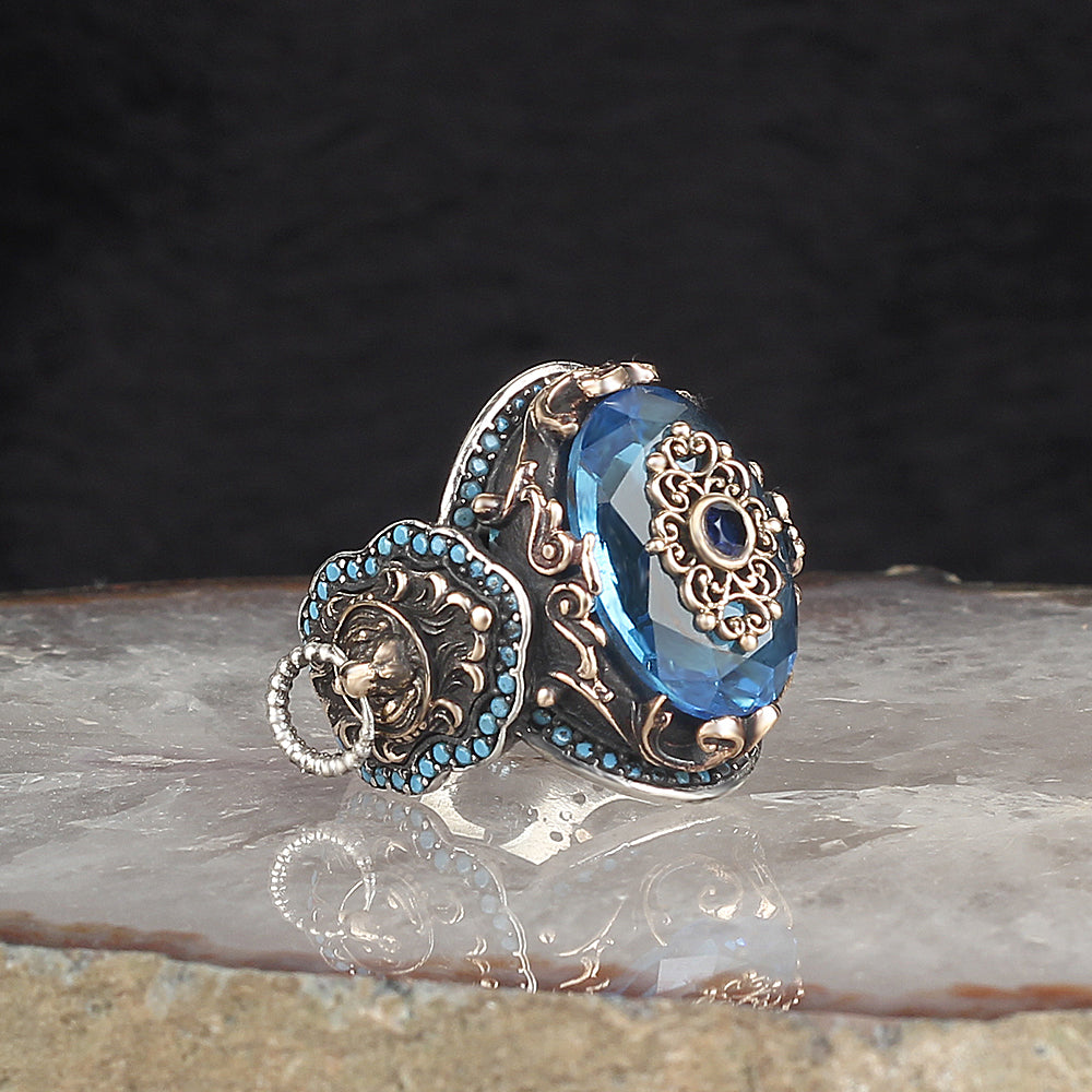 Aslan Simgeli Aqua Marin Taşlı 925 Ayar Gümüş Erkek Yüzük