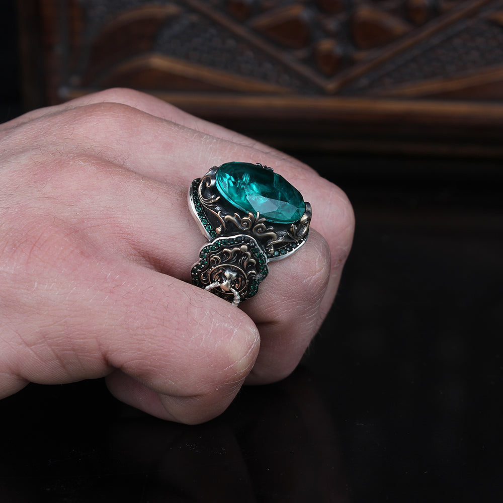 Aslan Simgeli Paraiba Taşlı 925 Ayar Gümüş Erkek Yüzük