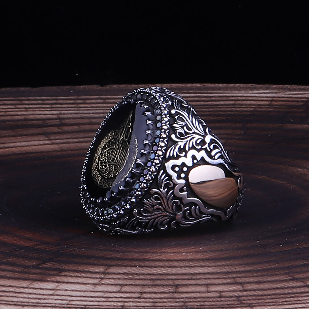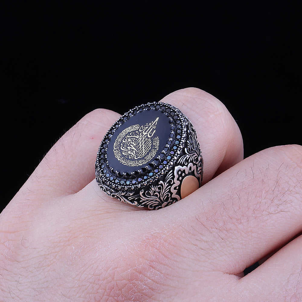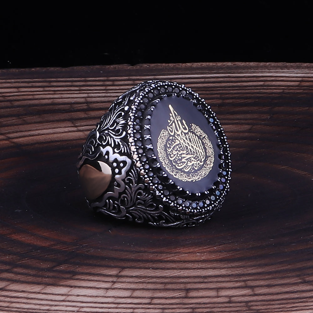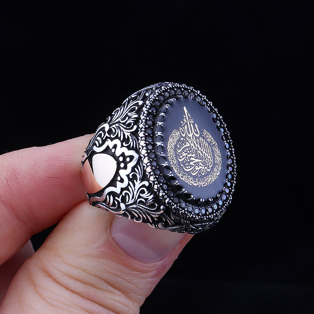 Ayetel Kürsi İşlemeli Mineli 925 Ayar Gümüş Erkek Yüzük