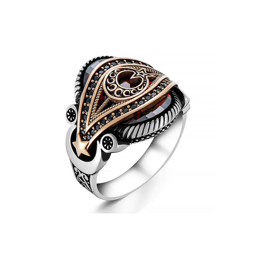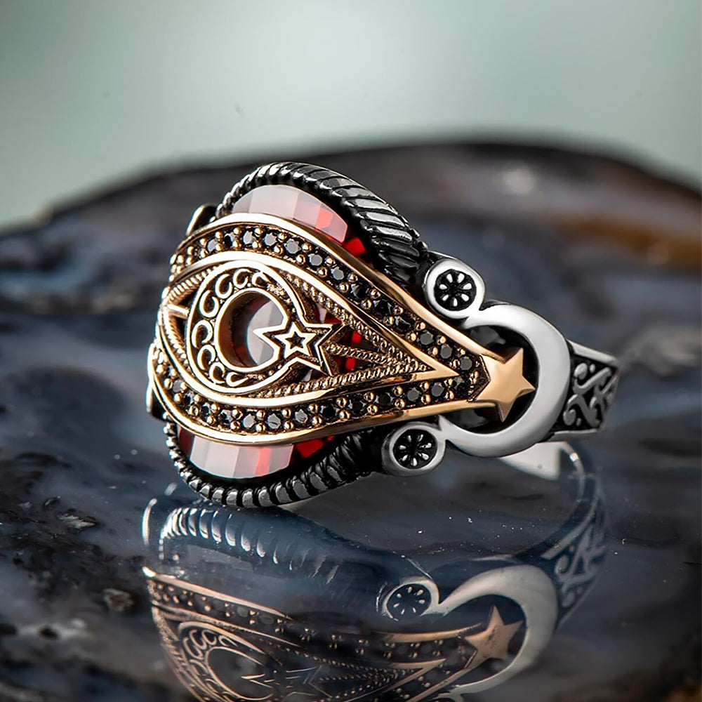 Ay Yıldız İşlemeli Kırmızı Zirkon Taş 925 Ayar Gümüş Erkek Yüzük