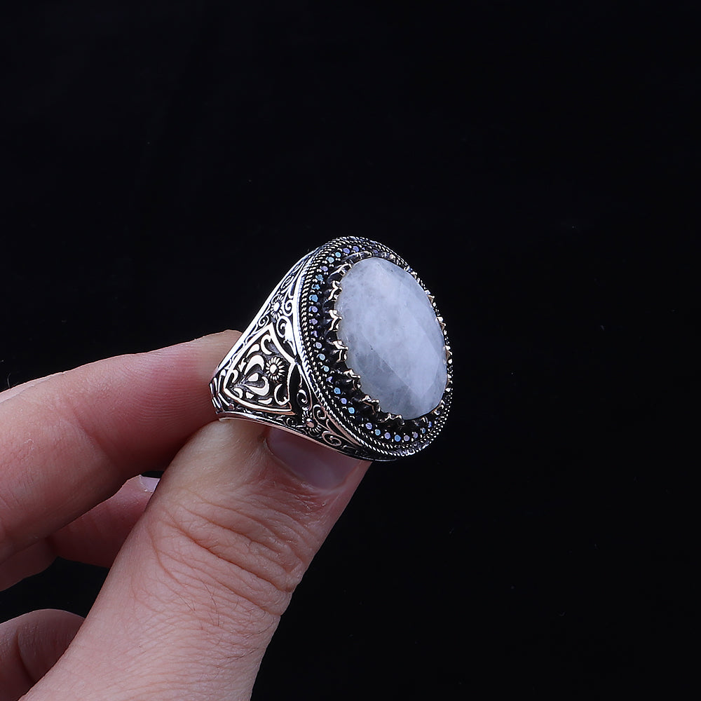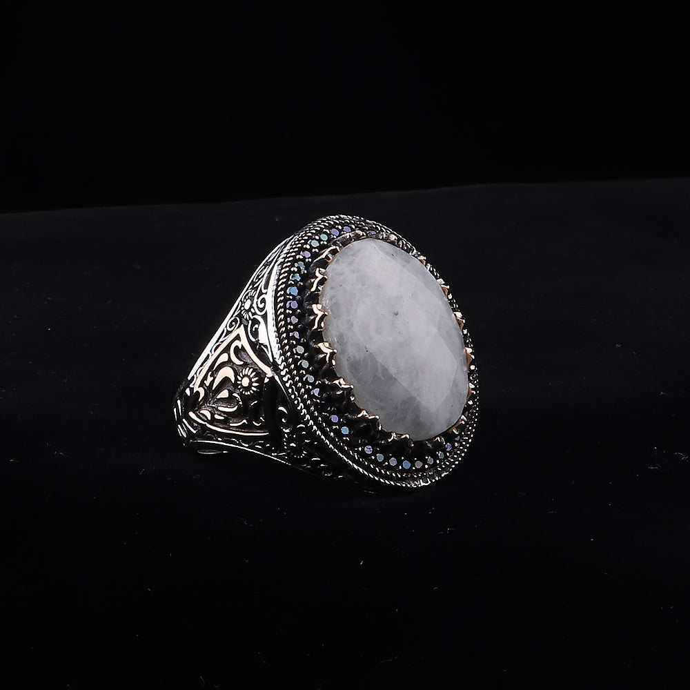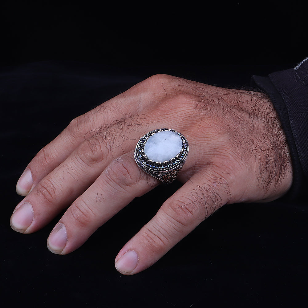 Doğal Ay Taşlı 925 Ayar Erkek Gümüş Yüzük