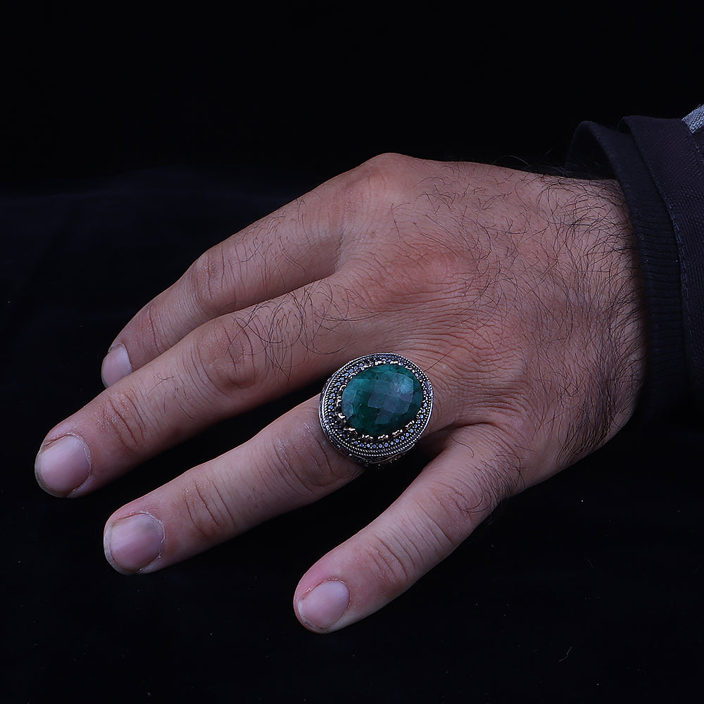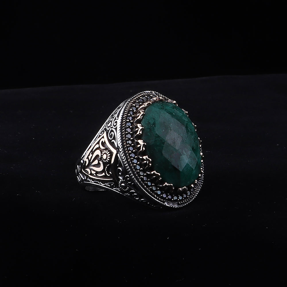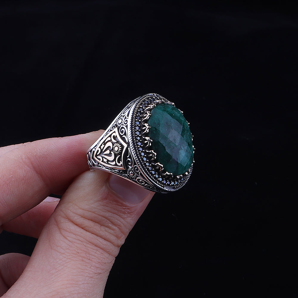 Doğal Zümrüt Taşlı 925 Ayar Erkek Gümüş Yüzük