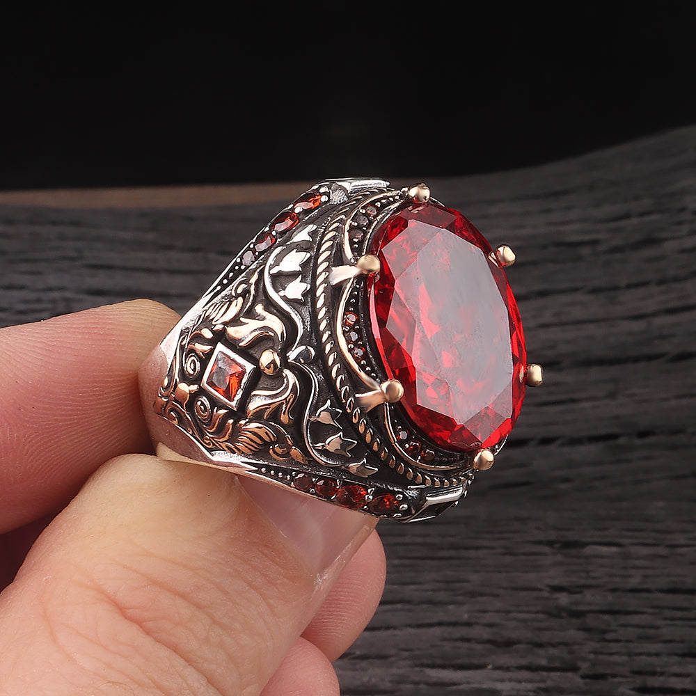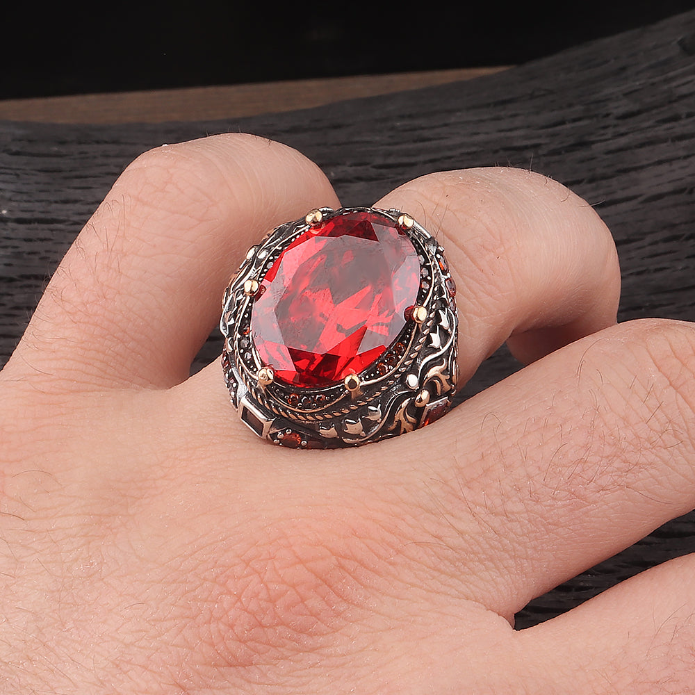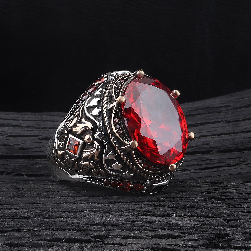 Fetih Serisi Kırmızı Zirkon Taşlı 925 Ayar Erkek Gümüş Yüzük
