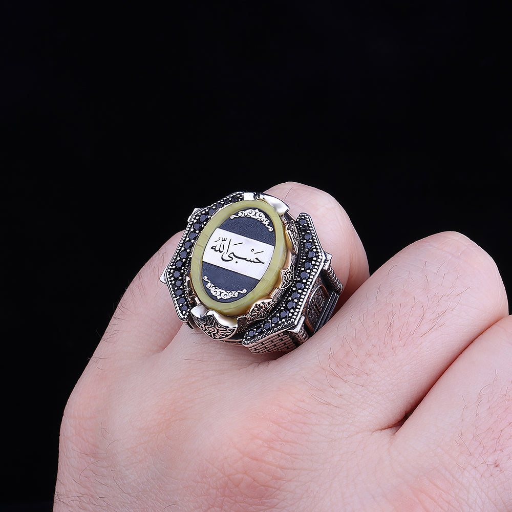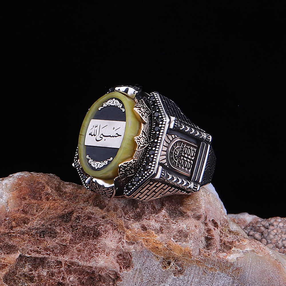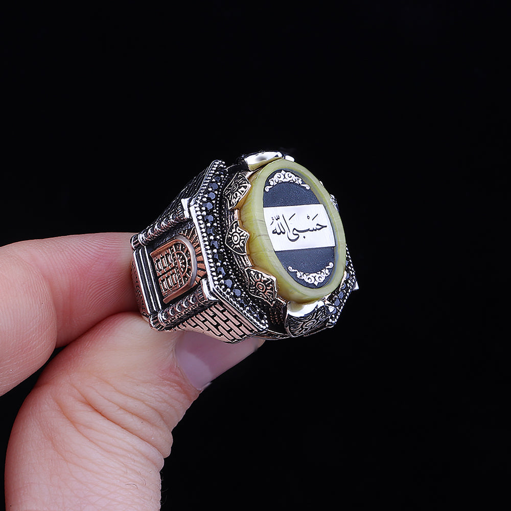 Kehribar taşlı işlemeli yüzükler arasında tercih edilen yüzük modellerinden biri de islami erkek gümüş yüzük modelleridir. Yüzükhane özel tasarımlarından biri olan Hasbiyallah Yazılı Kehribar Taşlı Gümüş Yüzüğü modelimize ait bilgiler aşağıda verilmiştir.