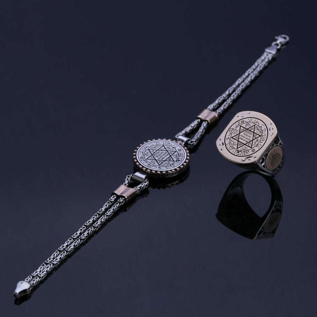 Hz Süleyman Mührü İşlemeli Gümüş Yüzük ve Bileklik Kombin