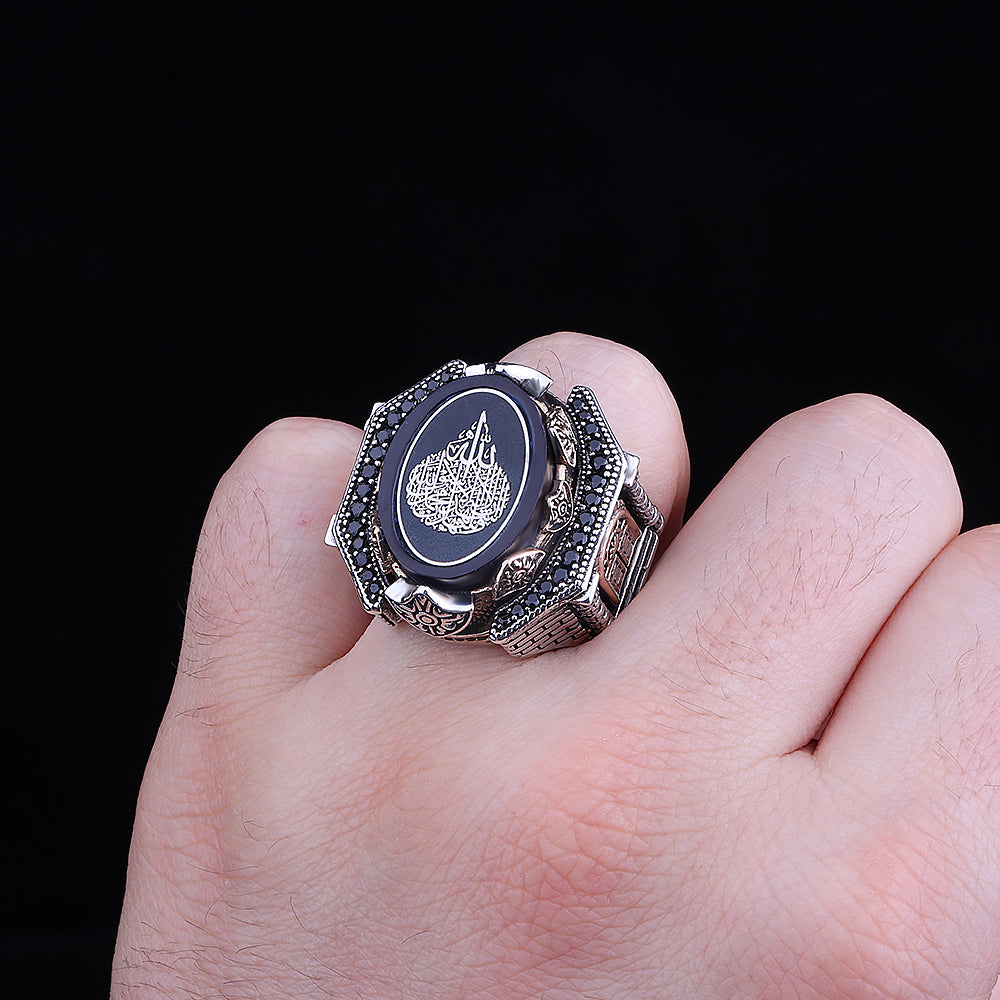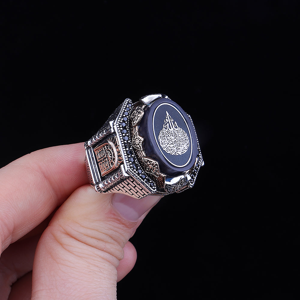 Kehribar taşlı işlemeli yüzükler arasında tercih edilen yüzük modellerinden biri de islami erkek gümüş yüzük modelleridir. Yüzükhane özel tasarımlarından biri olan Ayetel Kürsi Yazılı Kehribar Taşlı Gümüş Yüzüğü modelimize ait bilgiler aşağıda verilmiştir.