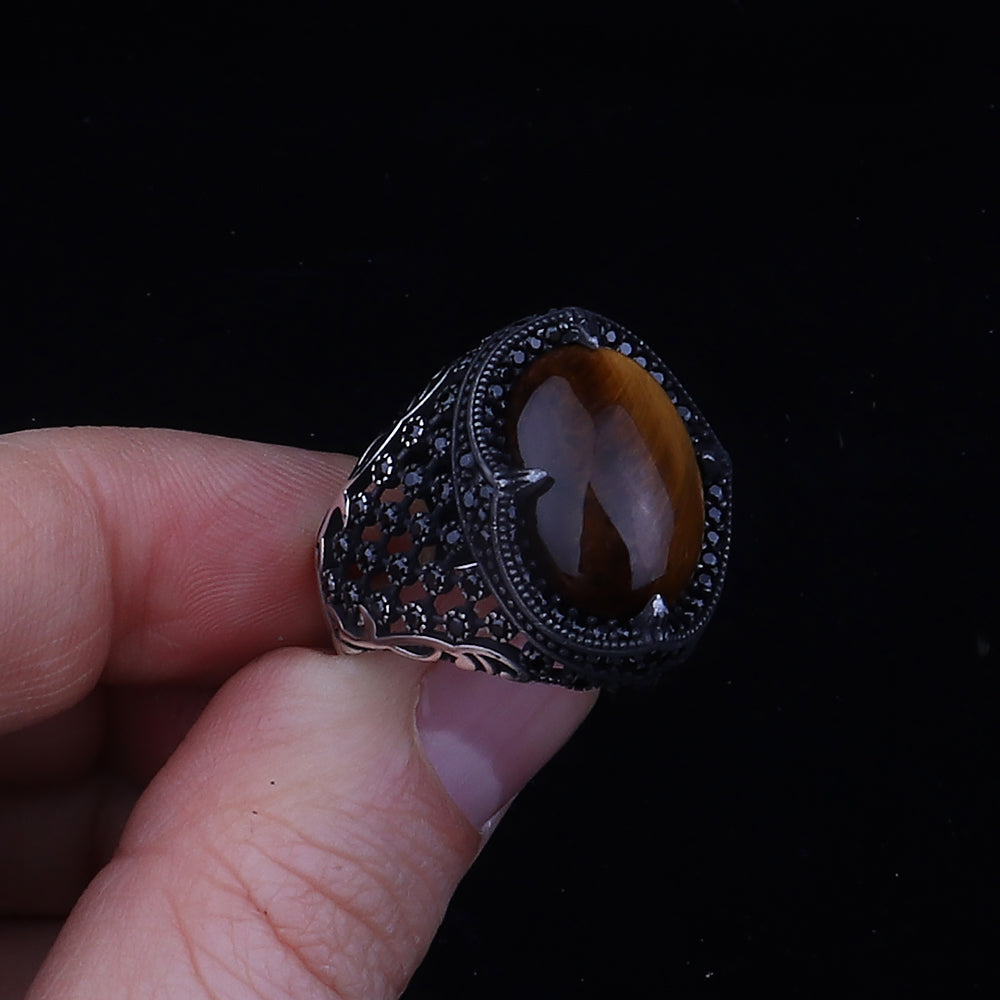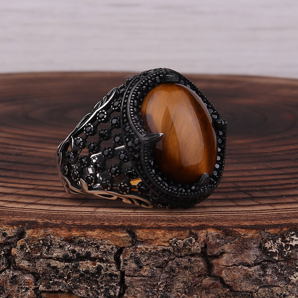 Kaplan Gözü Taşlı 925 Ayar Gümüş Erkek Yüzük