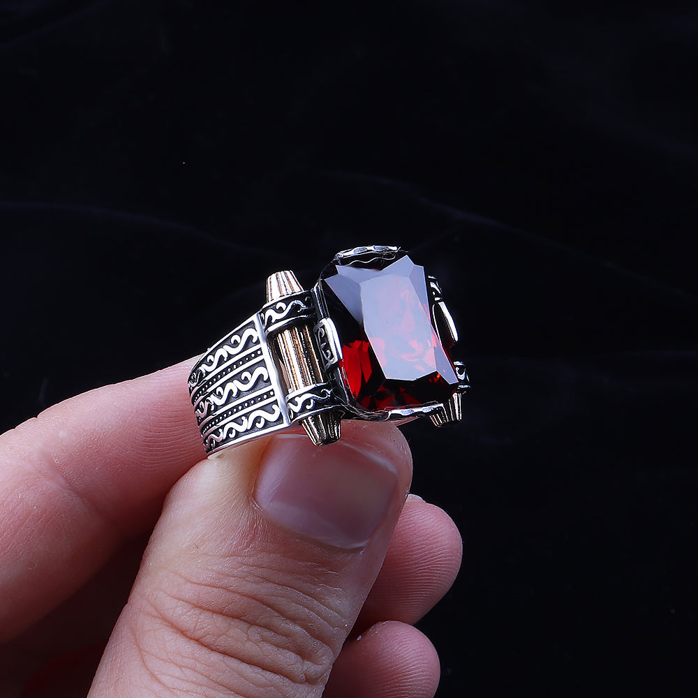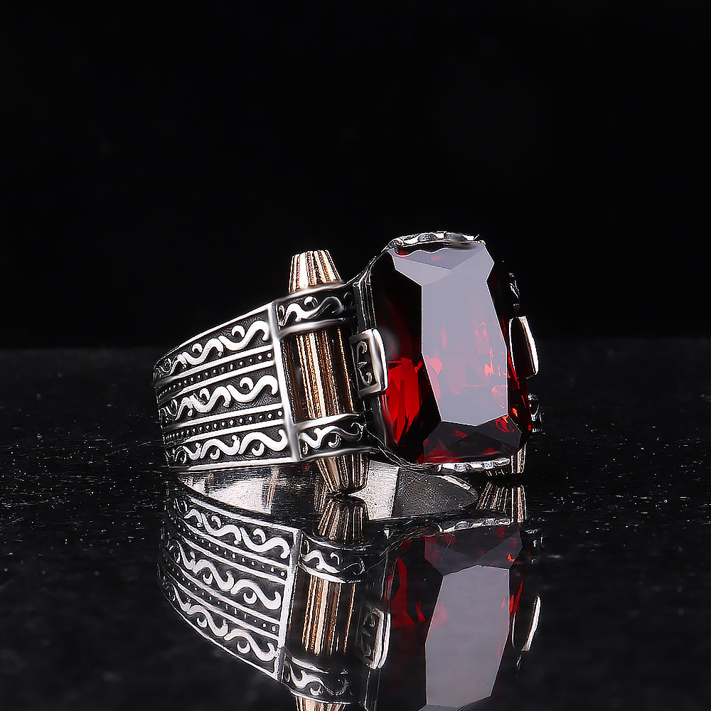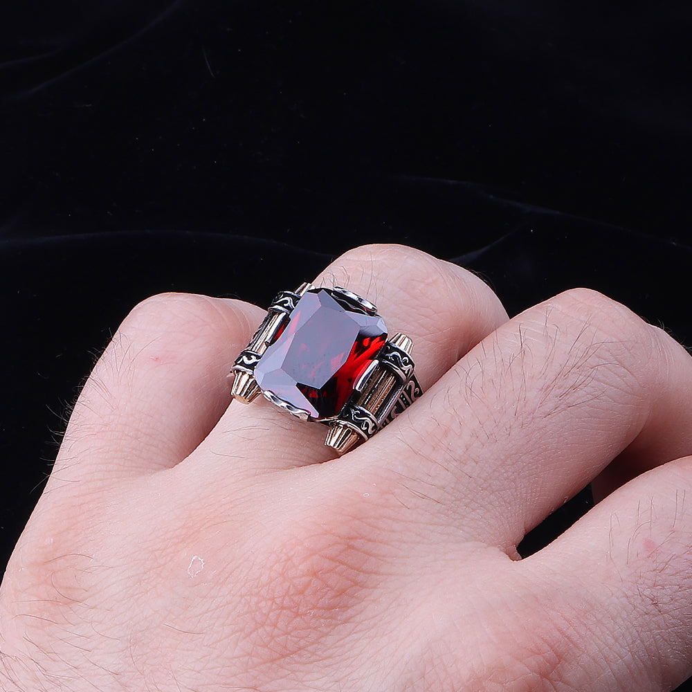 Kırmızı Zirkon Taşlı 925 Ayar Gümüş Erkek Yüzük