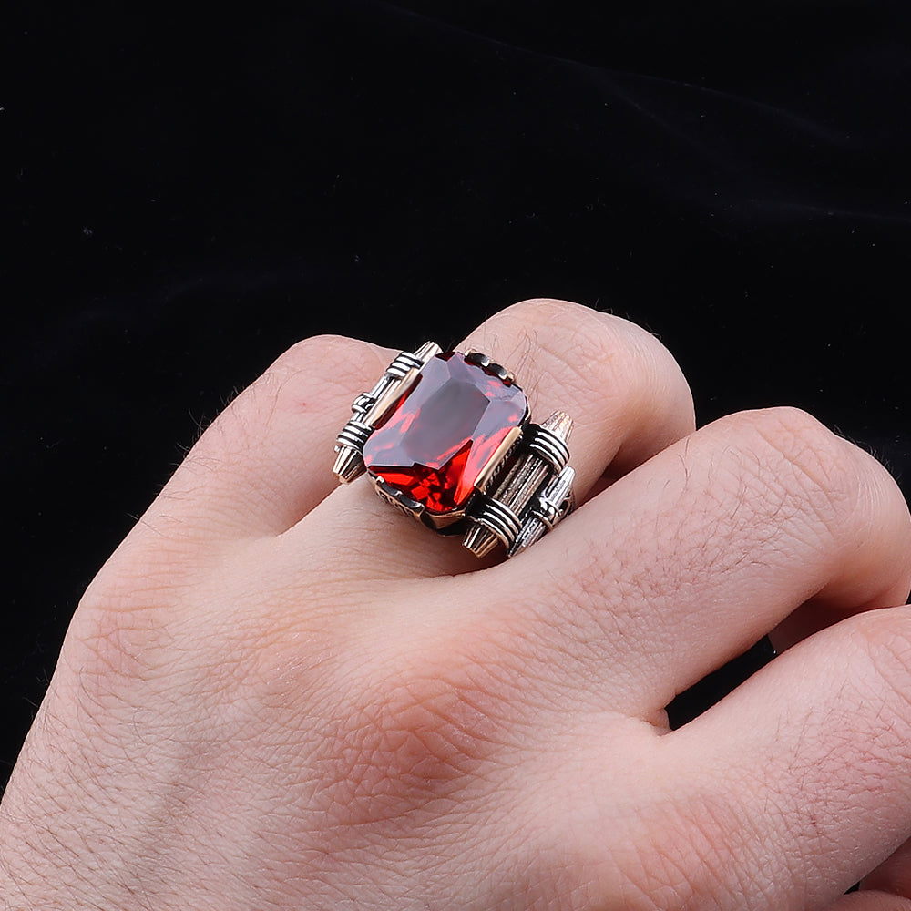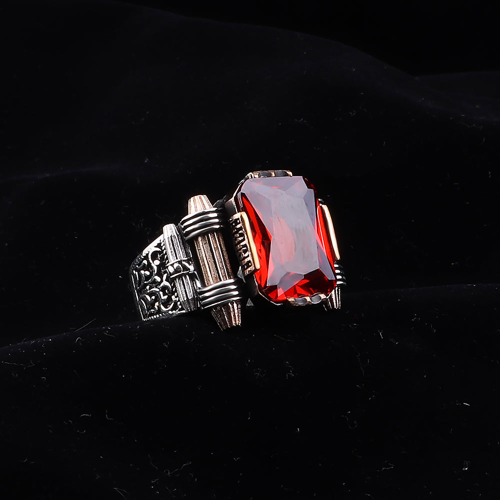 Kırmızı Zirkon Taşlı 925 Ayar Gümüş Erkek Yüzük