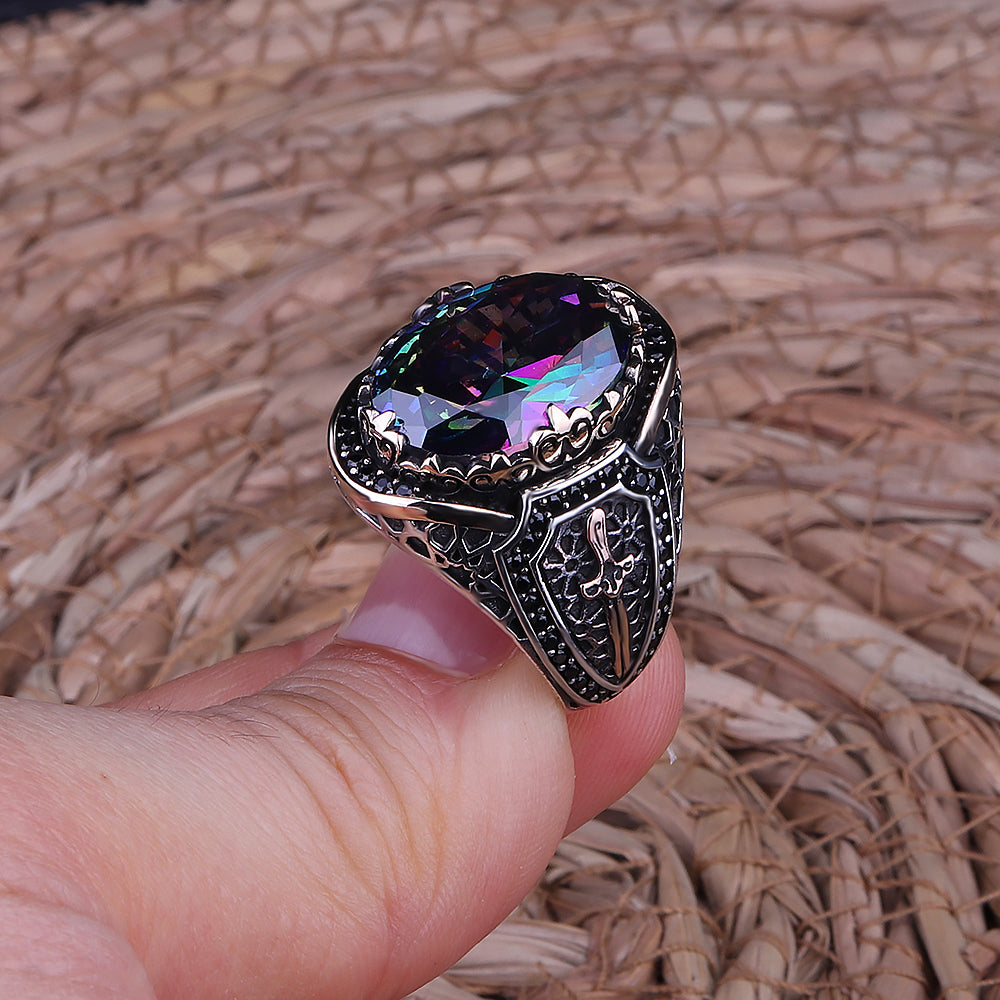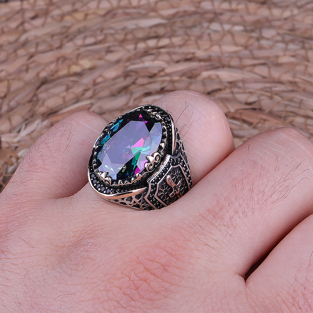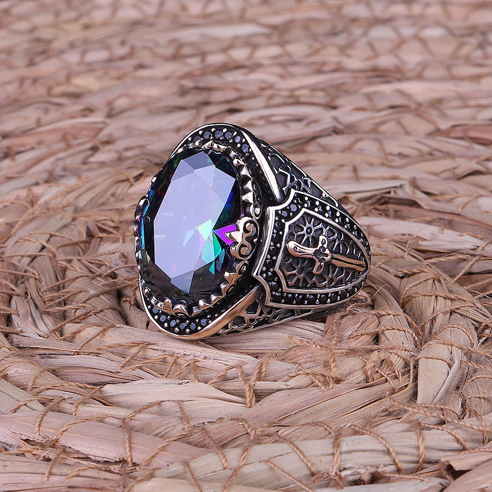 Erkek yüzükleri arasında tercih edilen gümüş yüzük mistik topaz taşlı yüzük modelleridir. Yüzükhane özel tasarımlarından biri olan Mistik Topaz Taşlı 925 Ayar Gümüş Erkek Yüzük modelimize ait bilgiler aşağıda verilmiştir.