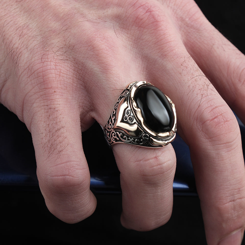 Oniks taşıyla koruma ve dengeyi simgeleyen, 925 ayar gümüşten üretilmiş şık erkek yüzük. Hem modern tasarımı hem de doğal taşın güçlü enerjisi ile stilinizi tamamlar. Kaliteli işçilik ve dayanıklı yapısıyla dikkat çeken bu yüzük, zarif ve güçlü bir aksesuar arayanlar için ideal.