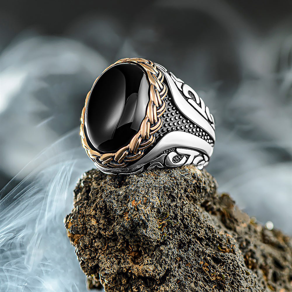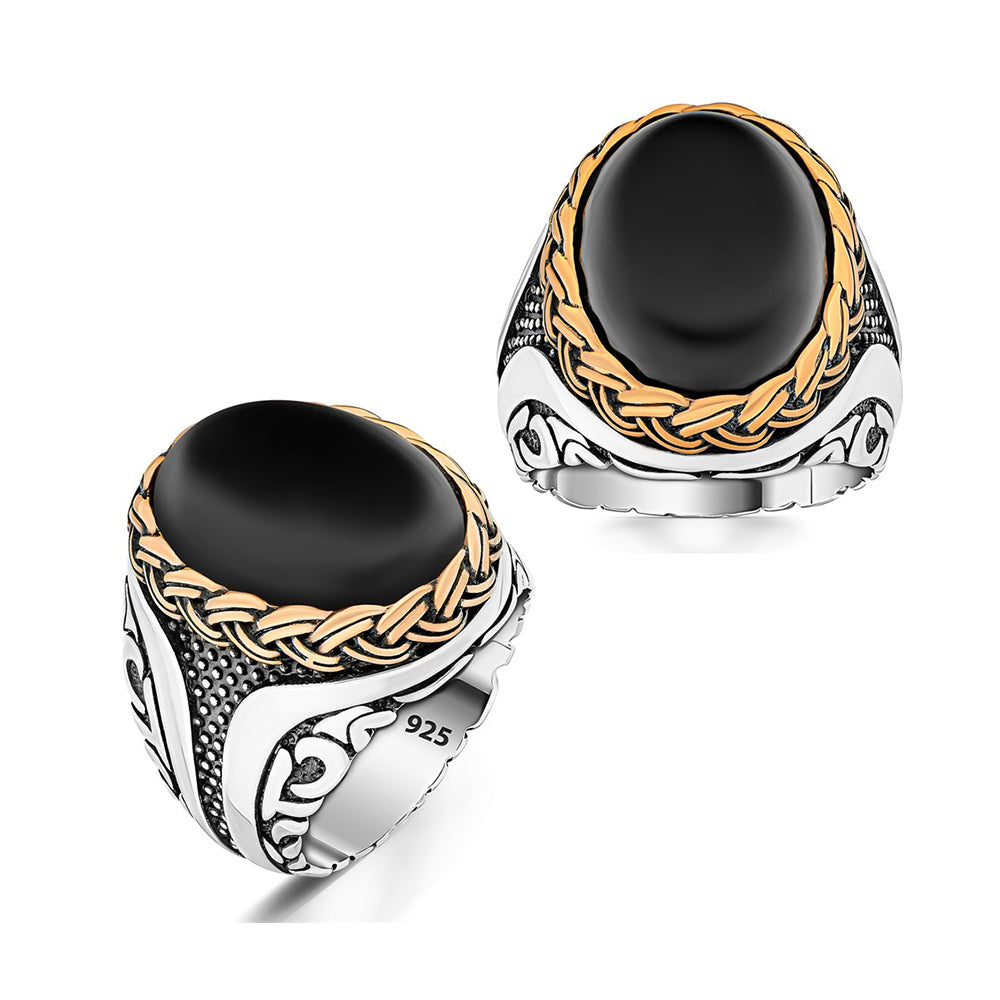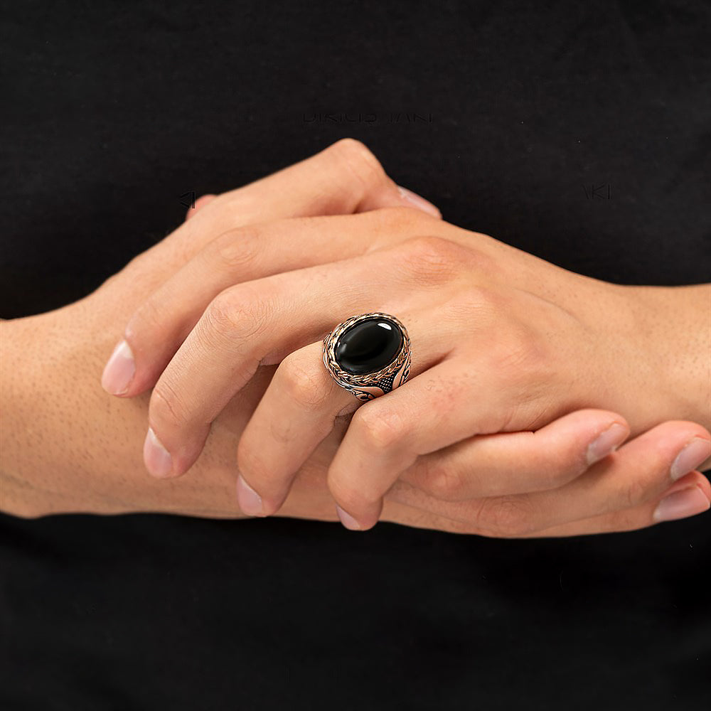 Örgü Motifli Oniks Taşlı Gümüş Erkek Yüzük