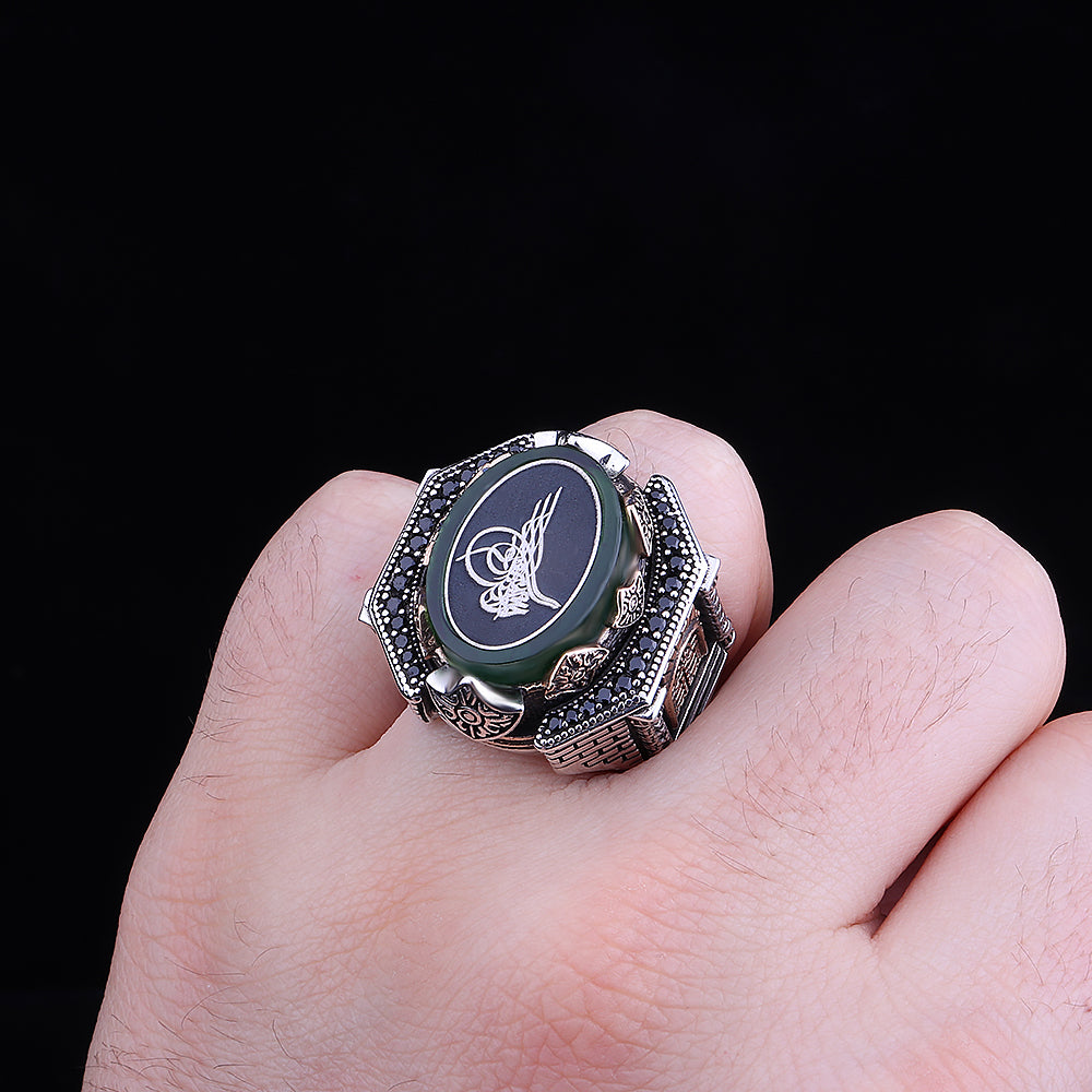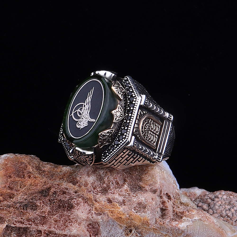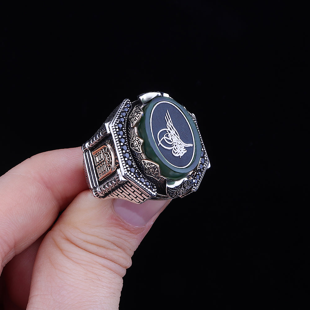 Kehribar taşlı işlemeli yüzükler arasında tercih edilen yüzük modellerinden biri de islami gümüş yüzük modelleridir. Yüzükhane özel tasarımlarından biri olan Osmanlı Tuğrası Motifli Kale Model Kehribar Taşlı Gümüş Yüzük modelimize ait bilgiler aşağıda verilmiştir.