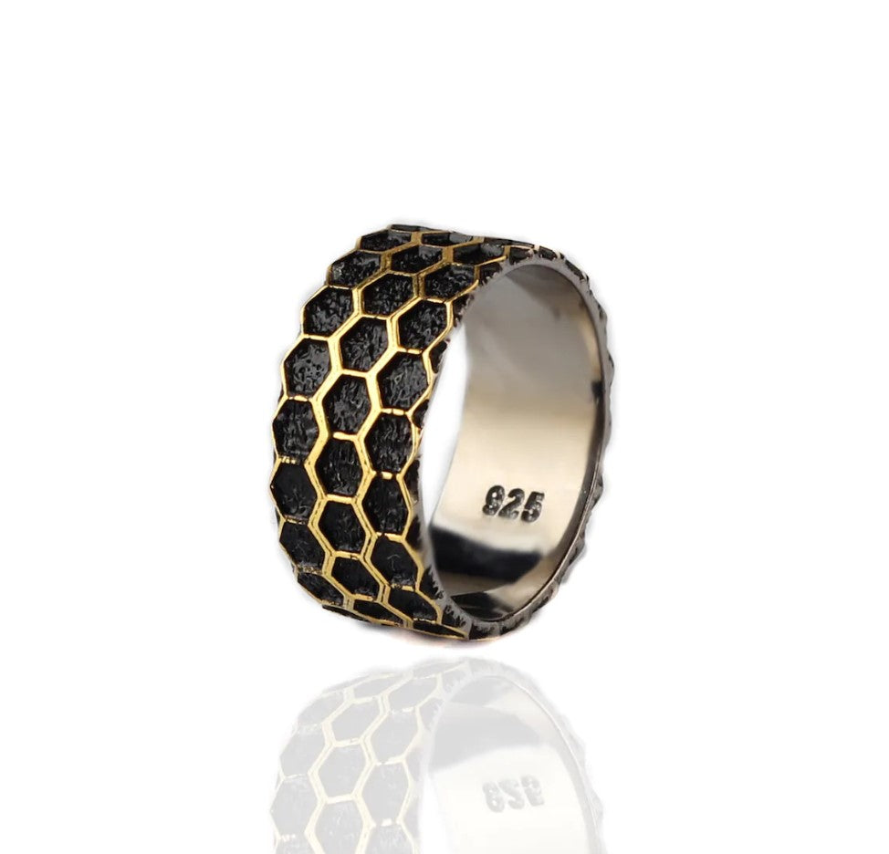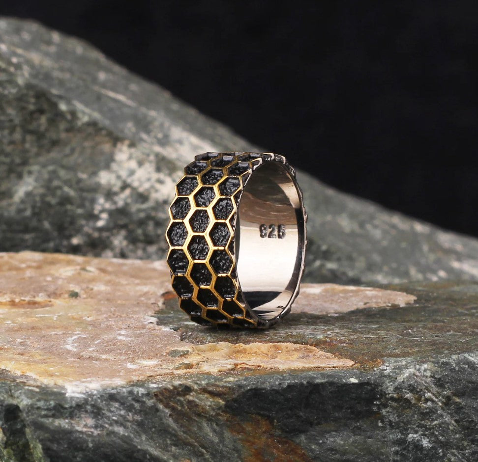 Rodaj Kaplamalı Petek Desenli 925 Ayar Gümüş Yüzük