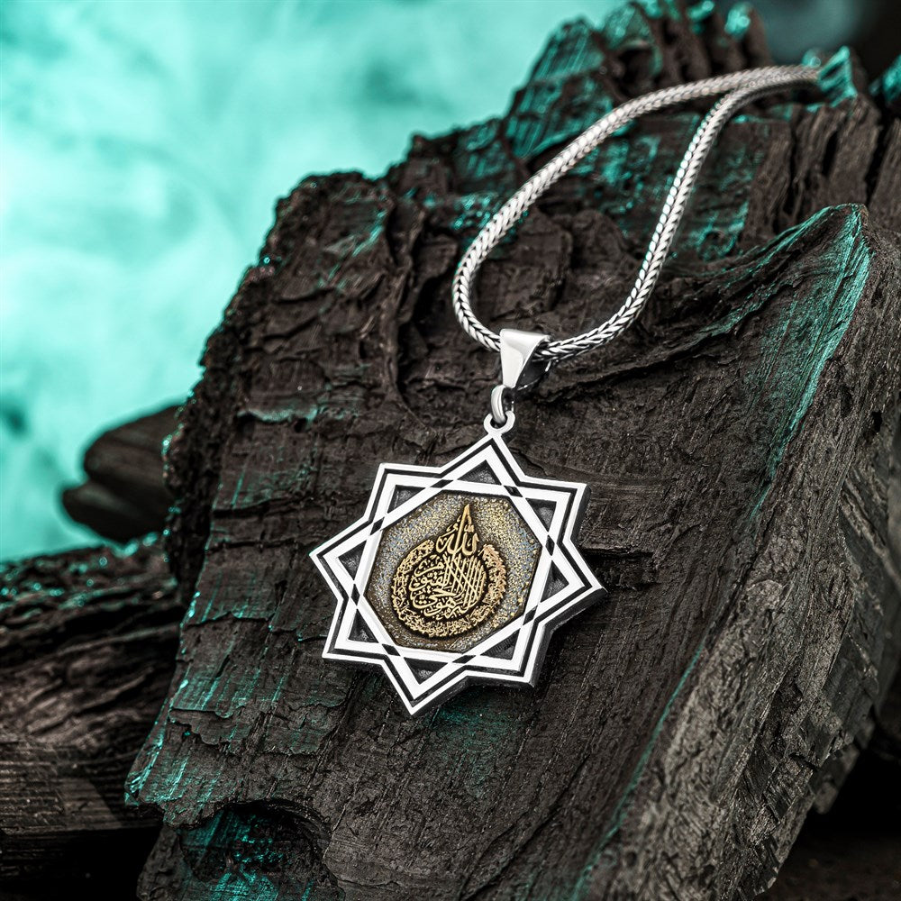 Erkek gümüş kolye modelleri arasında beğenilen modeller arasında işlemeli gümüş kolye modelleri mevcuttur. Yüzükhane özel tasarımlarından biri olan Selçuklu Yıldızı İçerisi Ayetel Kürsi İşlemeli Gümüş Kolye modelimizin özelliklerini aşağıda inceleyebilirsiniz.