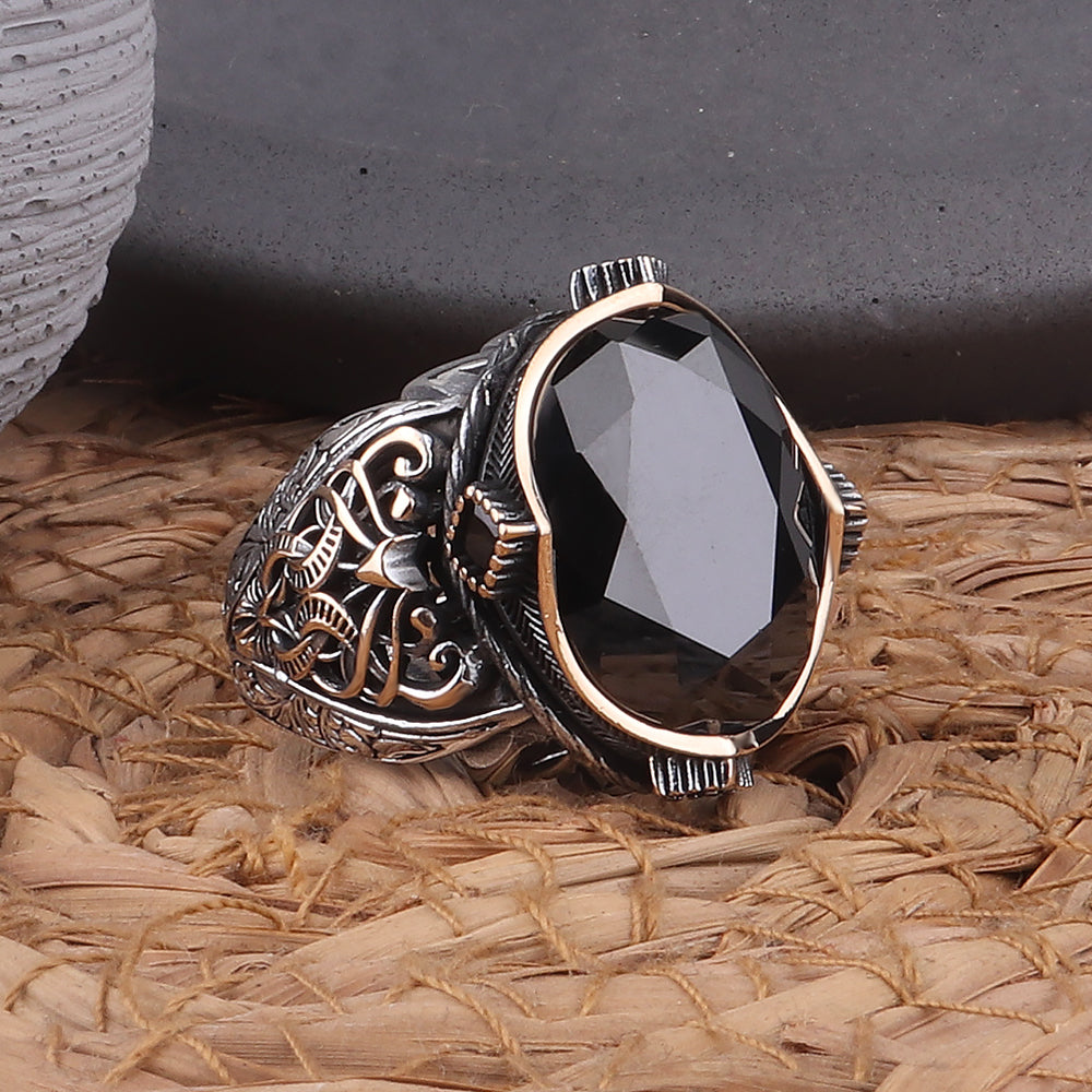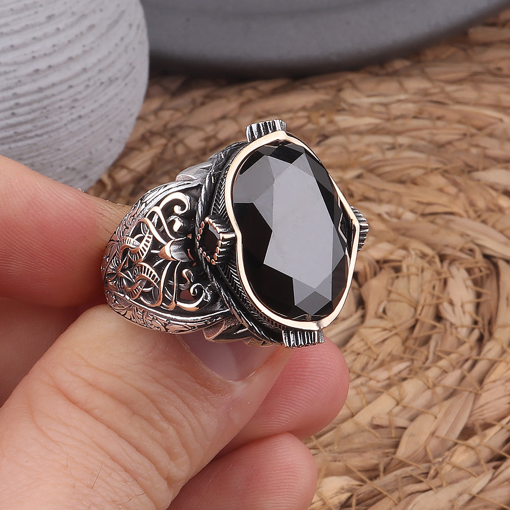 Siyah zirkon taşlı, kalem işlemeli 925 gümüş ayar erkek yüzük, zarif parçaları ve güçlü duruşuyla stilinizi tamamlıyor. Usta işçilikle üretilen bu özel tasarım yüzük, şıklığı ve gücünü bir araya getiriyor.