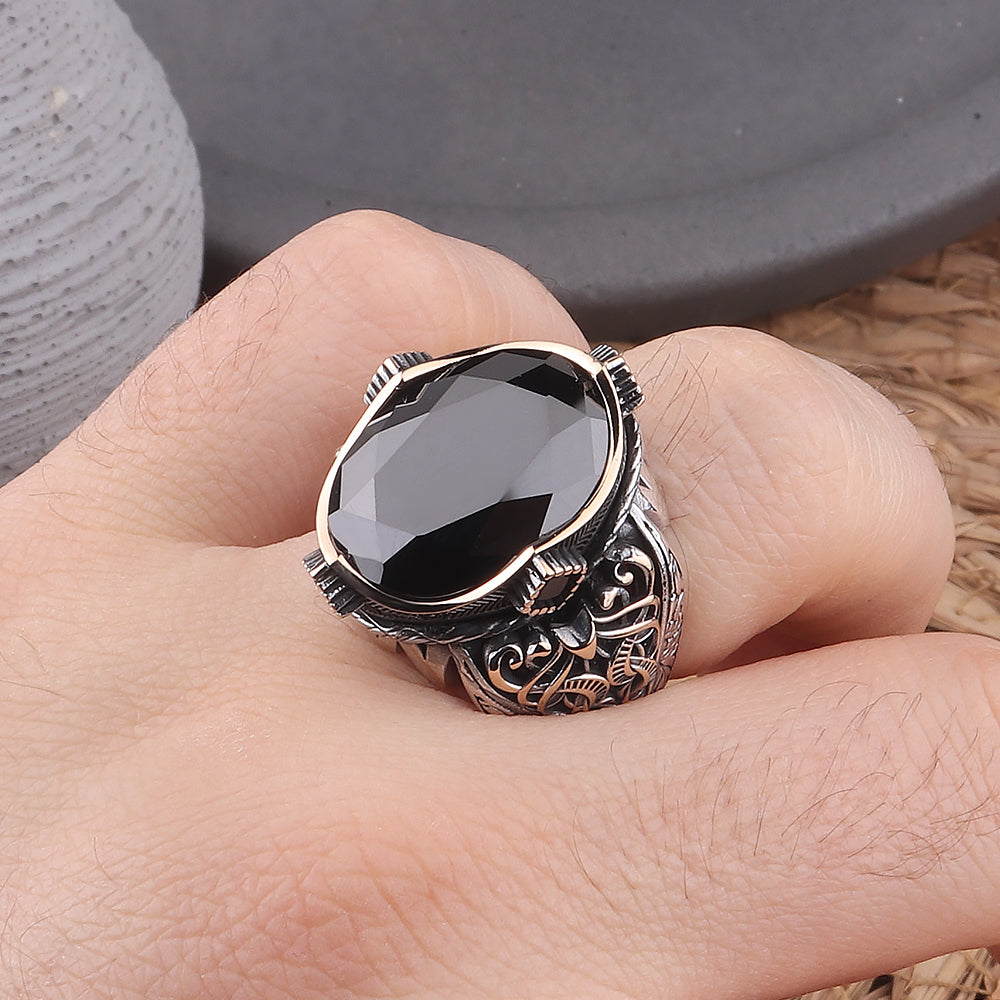 Siyah Zirkon Taşlı Kalem İşlemeli 925 Ayar Erkek Gümüş Yüzük
