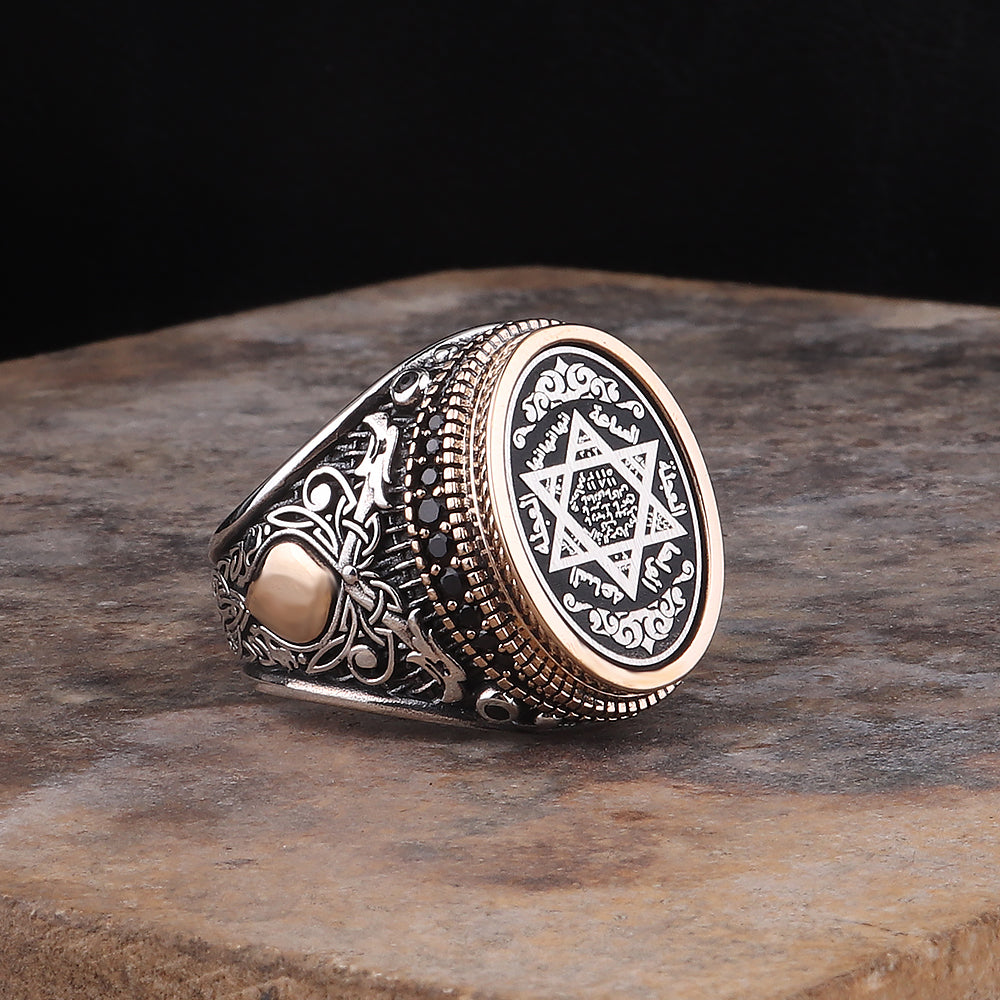 Süleyman Mührü İşlemeli Kehribar Taşlı 925 Ayar Erkek Gümüş Yüzük