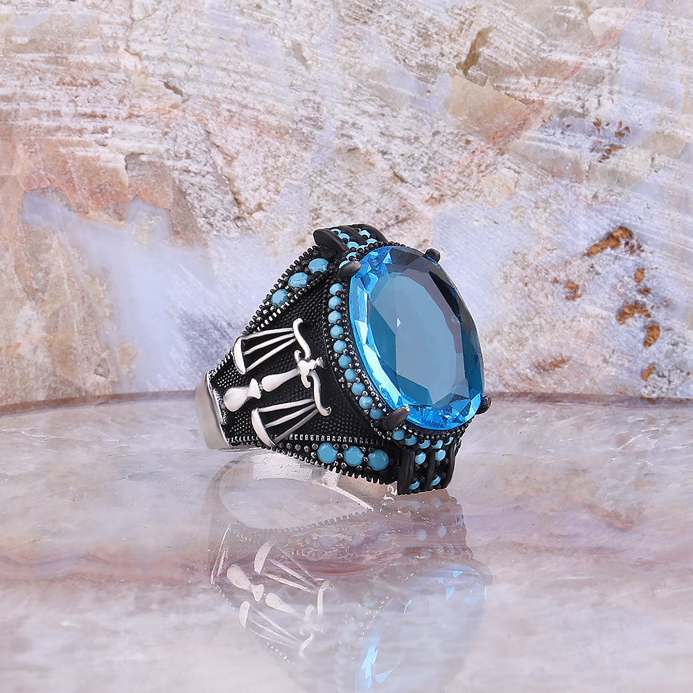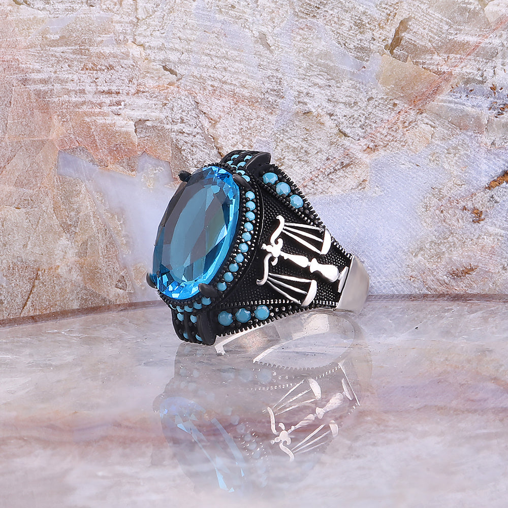 Terazi Motifli Aqua Taşlı 925 Ayar Gümüş Erkek Yüzük