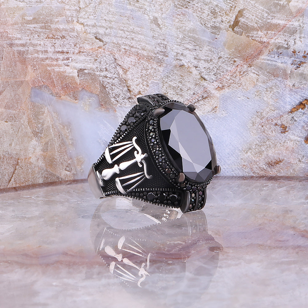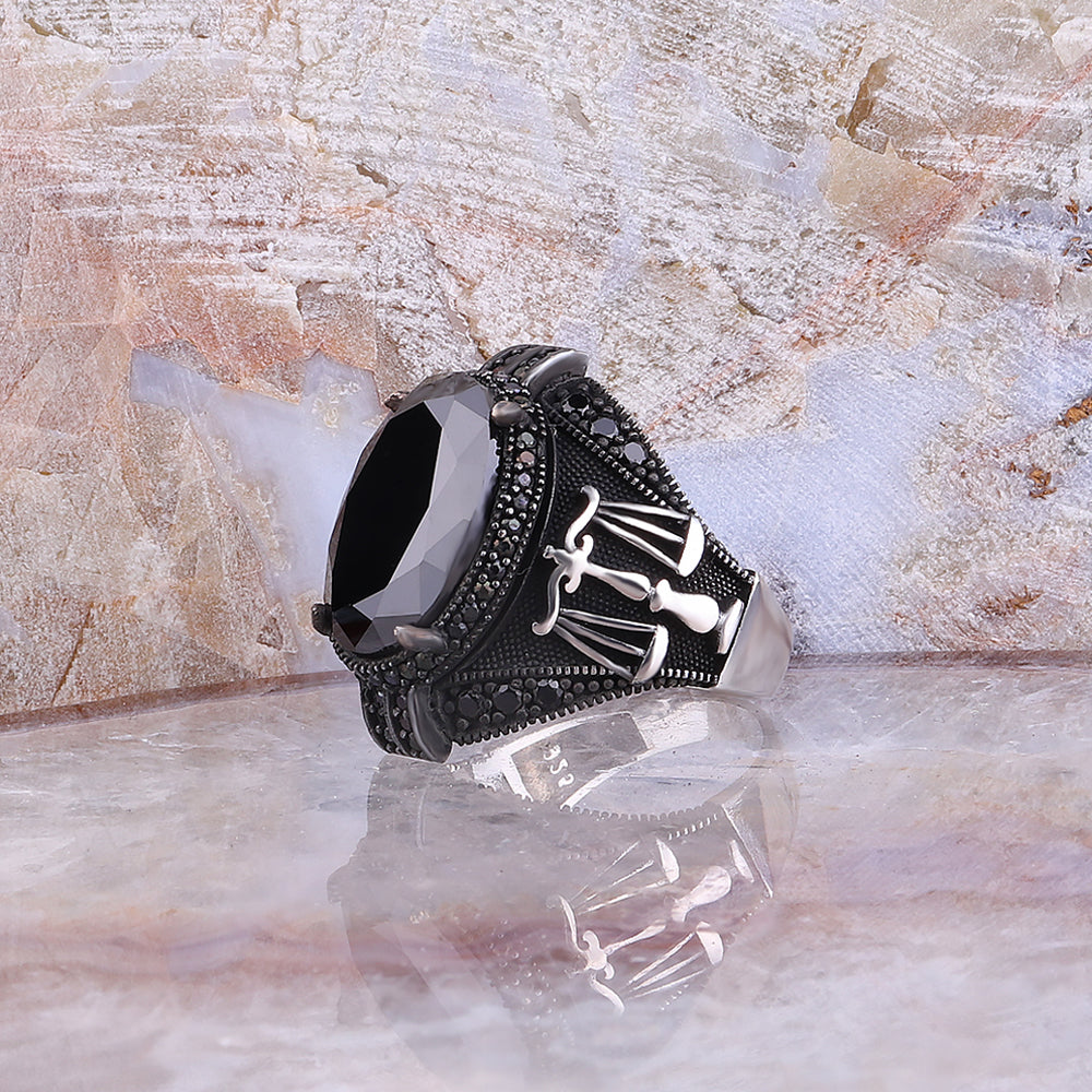 Terazi Motifli Siyah Zirkon Taşlı 925 Ayar Gümüş Erkek Yüzük