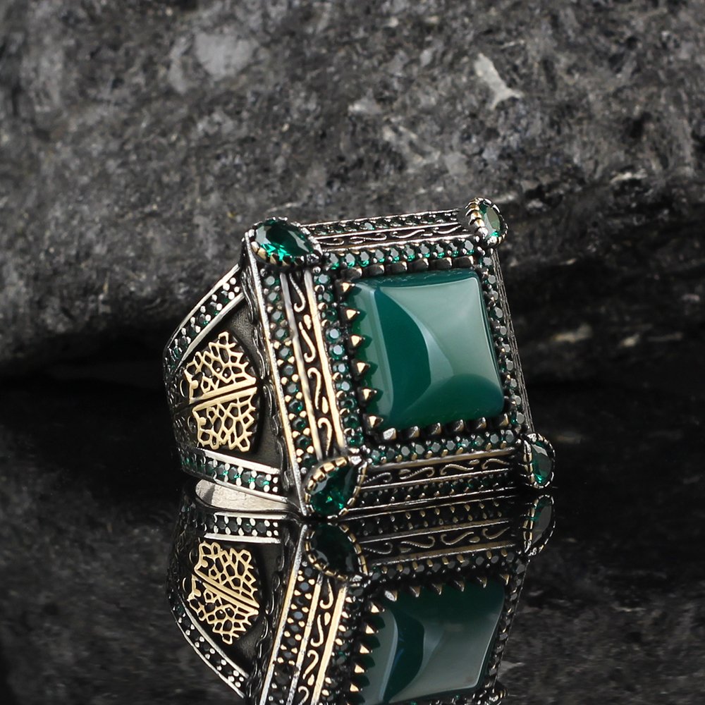 Yeşil Akik Taşlı 925 Ayar Gümüş Erkek Yüzük