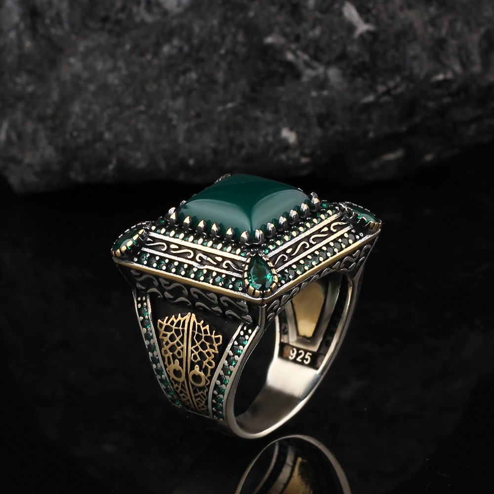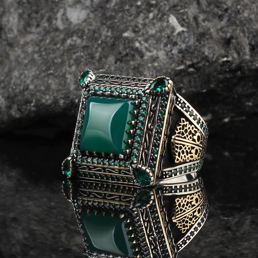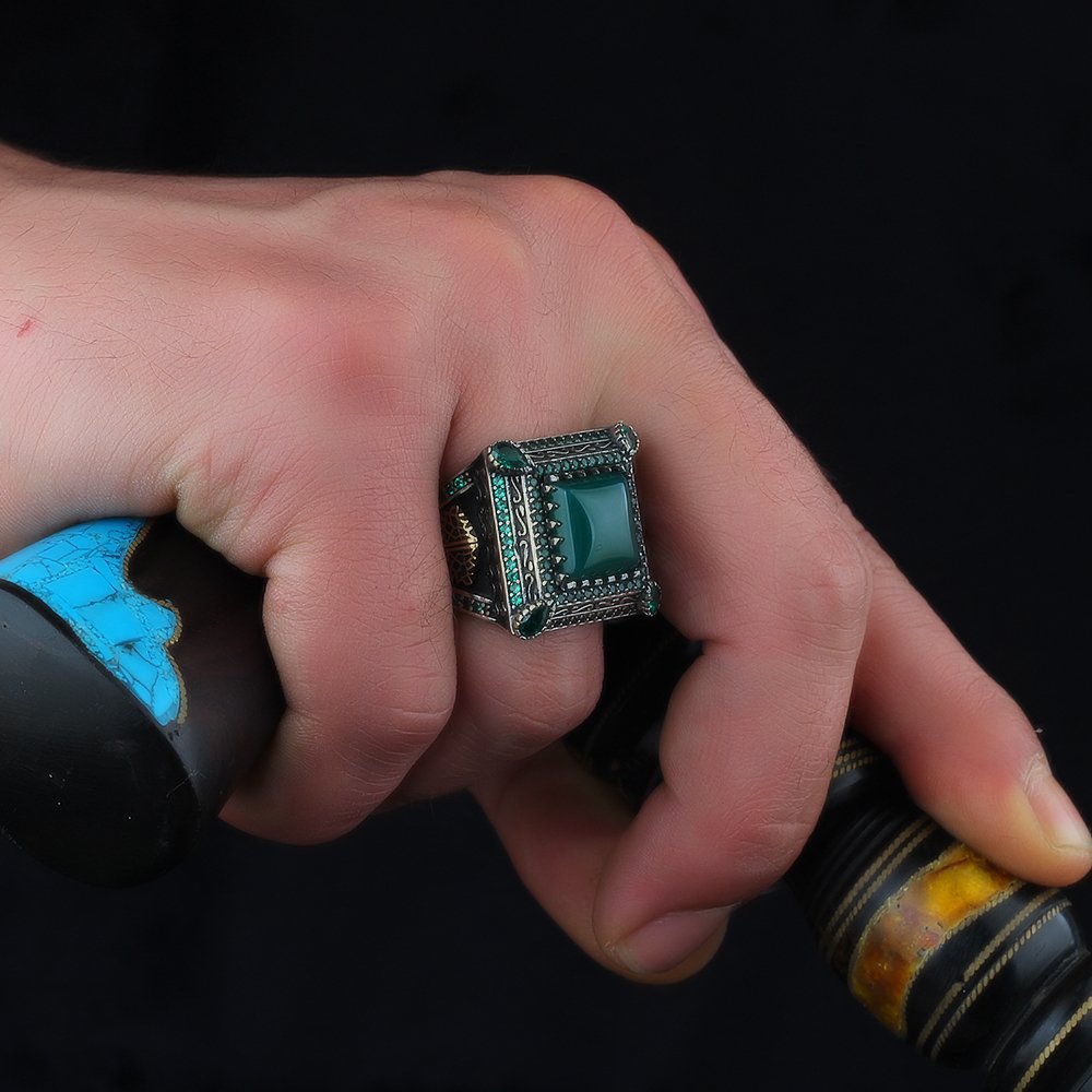 Erkek yüzükleri arasında en çok tercih edilen gümüş yüzük yeşil akik taşlı yüzük modelleridir. Yüzükhane özel tasarımlarından biri olan Yeşil Akik Taşlı 925 Ayar Gümüş Erkek Yüzük modelimize ait bilgiler aşağıda verilmiştir.