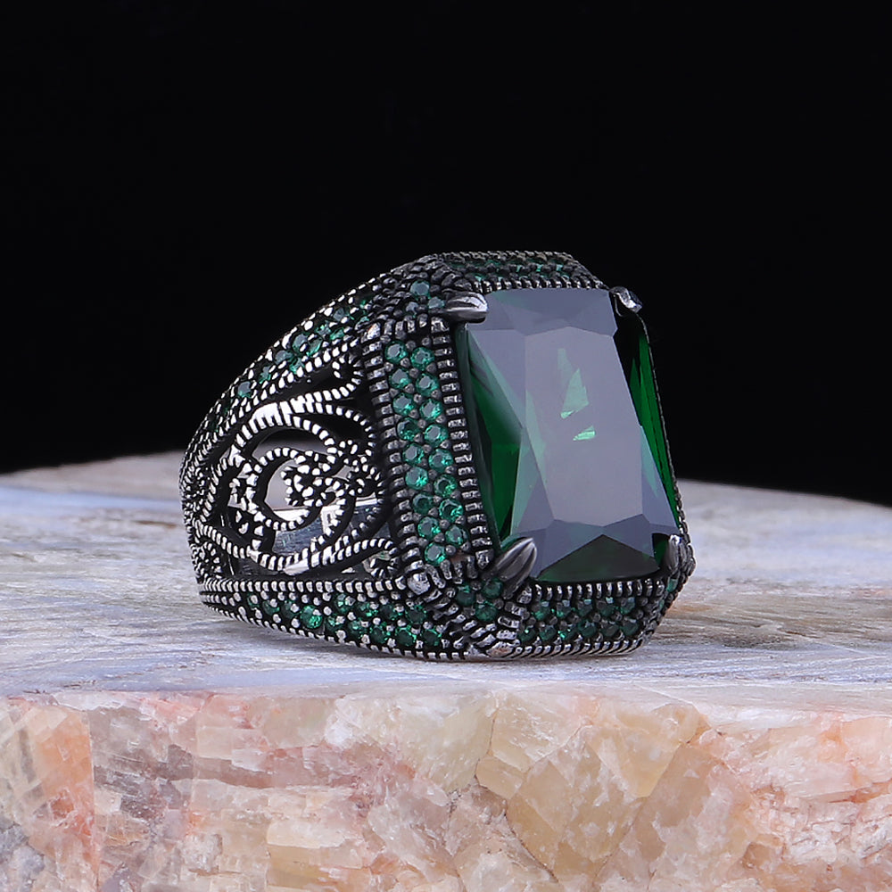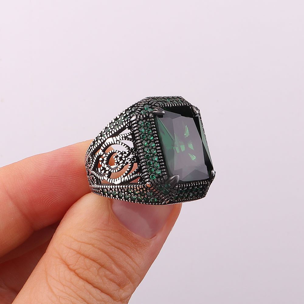 Yeşil Zirkon Taşlı 925 Ayar Gümüş Erkek Yüzük